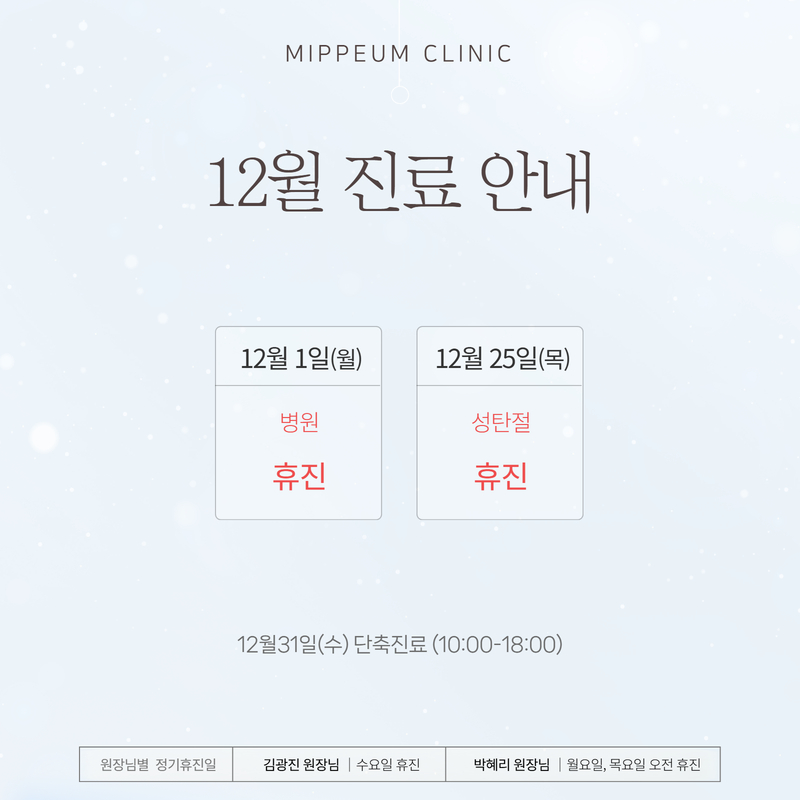 점심시간 오후 1:00 - 2:30 (토요일 제외) / 공휴일, 일요일 휴진 (팝업/공지사항 - 휴진일정 참고)